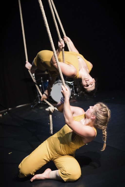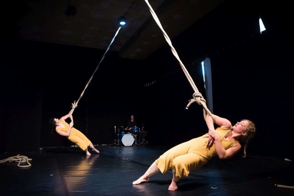 Mit den Seilen begeben sich die Tänzerinnen auf die Suche nach der Vielfalt der Möglichkeiten von Verbindungen, von Beziehungen. Es wird gespielt und gekämpft.